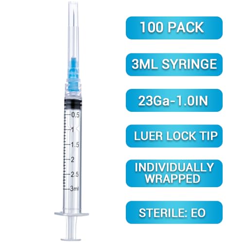 100 Pack Disposable 3ml Lab Syringes with 23Ga 1 Inch Needle Luer Lock, Individually Sterile Wrapped