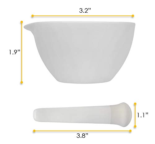 2 OUNCE CAPACITY || Mortar has a 2oz (60ml) capacity and measures 3.2″ wide and 1.9″ tall. Pestle measures 3.8″ in length and rounded end measures 1.1″ in diameter