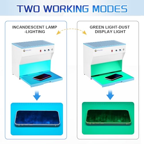 4.【Switching between dust display lamp and lighting lamp】: Adopting dual lamp switching mode and adjustable brightness design, it can freely switch between working lighting and dust display modes. Incandescent lamps can be chosen for work lighting, which can more clearly illuminate small bubbles and small parts. In cleaning and maintenance work, fluorescent green dustproof lights can make small dust nowhere to hide, making cleaning more convenient and efficient.