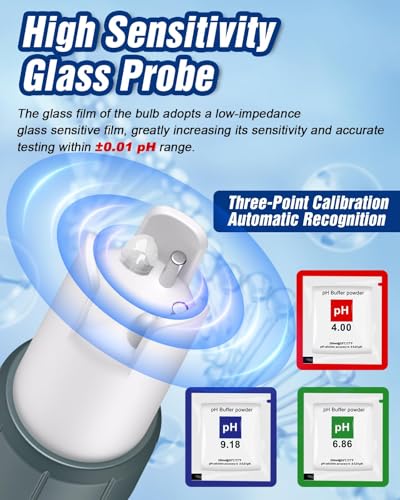 AUTOMATIC CALIBRATION PH TESTER – Digital pH meter has the function of automatic calibration, and is equipped with calibration powder of pH 4.00/pH 6.86/pH 9.18, just press the automatic calibration button, water pH meter will automatically identify the calibration solution. Automatic calibration can ensure accurate and consistent readings every time