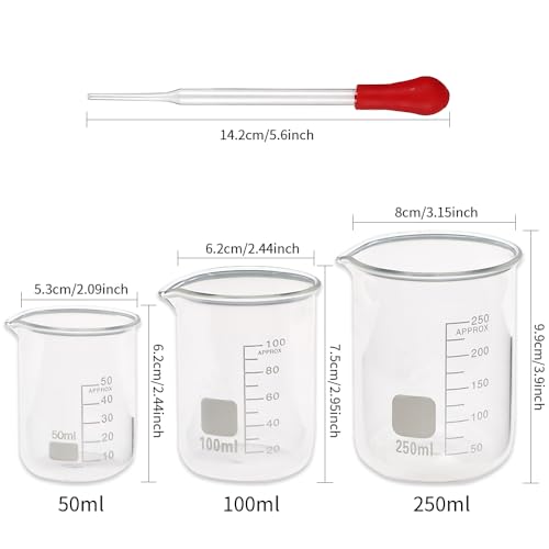 SUPERLELE Glass Graduated Cylinder Set 10ml 25ml 50ml 100ml, Thick Glass Beaker Set 50ml 100ml 250ml with 2 Droppers